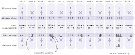 The advantage distillation procedure is schematically shown in Figure 10. The example raw string of a length 36 bits is divided into 12 blocks. For each block a, Alice announces a and and the rule according to which blocks will be translated to the bits of the new string. If Bob’s block coincides with a or , it is transformed into one bit of a new string (see 2nd, 3rd, 6th, 8th, 10th, and 11th blocks in Figure 10), otherwise it is discarded. The length of the blocks, M, should be chosen in accordance with the observed parameters (the raw BER, , and leakage, ) to achieve the maximally attainable key rate.