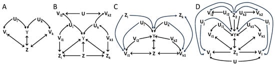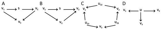 Beyond equality constraints, the causal structure may also impose inequality constraints on the distribution of the data [15,16], which reflect non-verifiable independencies involving hidden variables. Figure 1 illustrates this distinction between pairs of causal structures distinguishable based on independence constraints (Figure 1A,B) and causal structures that may be discriminated based on inequality constraints (Figure 1C,D). The structures of Figure 1A,B belong to different Markov equivalence classes because in Figure 1A variables and are independent conditioned on S, while in Figure 1B, to obtain an independence it is required to further the condition on . On the other hand, the structures of Figure 1C,D belong to the same equivalence class because no independencies exist between the observable variables . Nonetheless, if the hidden variables were also observable, these structures would be distinguishable. In Figure 1D, all the dependencies between the observable variables are caused by a single hidden variable U, while in Figure 1C dependencies are created pairwise by different hidden variables. In this case, a testable inequality constraint involving the observable variables reflects the non-verifiable independencies that involve also hidden variables. Intuitively, in Figure 1C, the inequality constraint imposes an upper bound on the overall degree of dependence between the three variables, given that these dependencies arise only in a pairwise manner, while in Figure 1D no such bound exists.