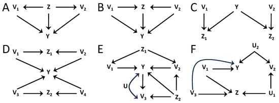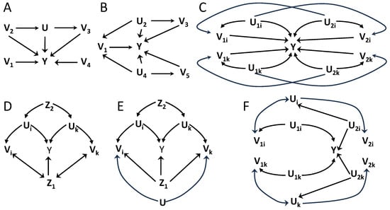 . Augmenting the groups to , , and the conditions of Proposition 3 are fulfilled, as can be verified by d-separation. Coefficients are determined by due to the intersection of the groups in U. Note that hidden variables are not restricted to be hidden common ancestors, and here U is a mediator between and . In Figure 2B, consider groups , , , which do not fulfill the conditions of Proposition 1. Augmenting the groups to , , , , , and the conditions are fulfilled. Maximal intersection values are . In both examples the upper bound is since cannot be estimated due to hidden variables.
