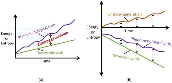 Illustrations of the phenomenological entropy generation theorem for (a) energy addition/system formation and (b) energy extraction/system loading . Reproduced from [].