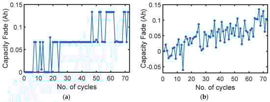 Cyclic capacity fade measured during consistent cycling of Samsung single-cell 3.6 V, 2.5 Ah lithium-ion polymer battery []. (a) Discharge steps; (b) recharge steps.
