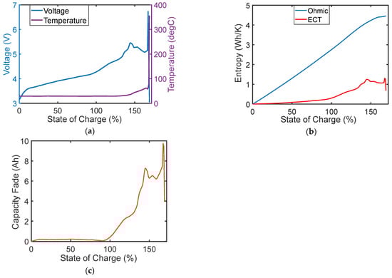 Battery degradation analysis via the transformation–phenomenological entropy generation methodology. is battery voltage, T is temperature, is charge content, I is current and is capacity fade. vT, ECT: ElectroChemicoThermal. The arrows indicate process direction, i.e., charge C follows discharge D. Reproduced from [].