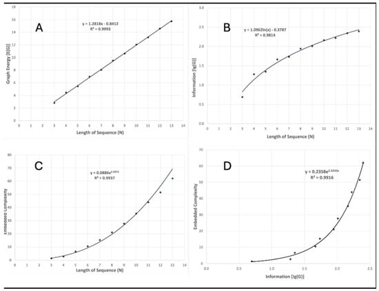 Trends in graph energy, information, and embedded complexity as sequence length increases (A–C); relationship between structural information and embedded complexity (D).