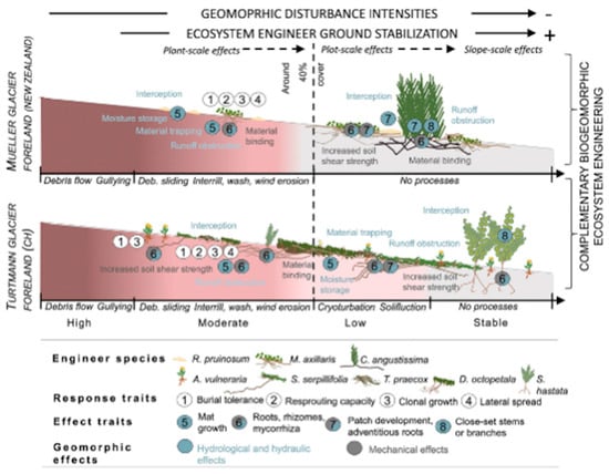 Two examples of glacial forefield succession, emphasizing the interaction of biological processes and geomorphic disturbances (Reproduced under a CC BY 4.0 license from Eichel, J.; Draebing, D.; Winkler, S.; Meyer, N. 2023. Similar vegetation–geomorphic disturbance feedbacks shape unstable glacier forelands across mountain regions. Ecosphere 14, e4404.) [39].