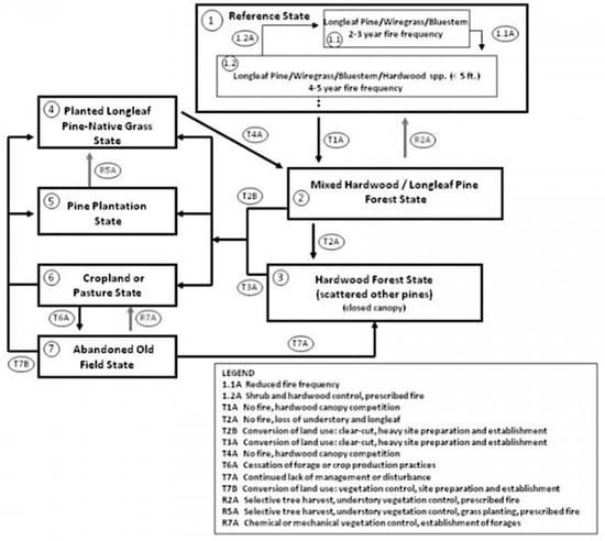 Figure 5 shows an STM for longleaf pine woodlands in the southeastern U.S.A. These systems are found in South Carolina and Georgia in U.S. Department of Agriculture Major Land Resource Area 153A—Atlantic Coast Flatwoods. The STM applies to the ecological site designation loamy rise, moderately wet, described in detail in the ecological site description from the Ecosystem Dynamics Interpretation Tool (https://edit.jornada.nmsu.edu/catalogs/esd/153A/R153AY001GA; accessed on 24 March 2024).
