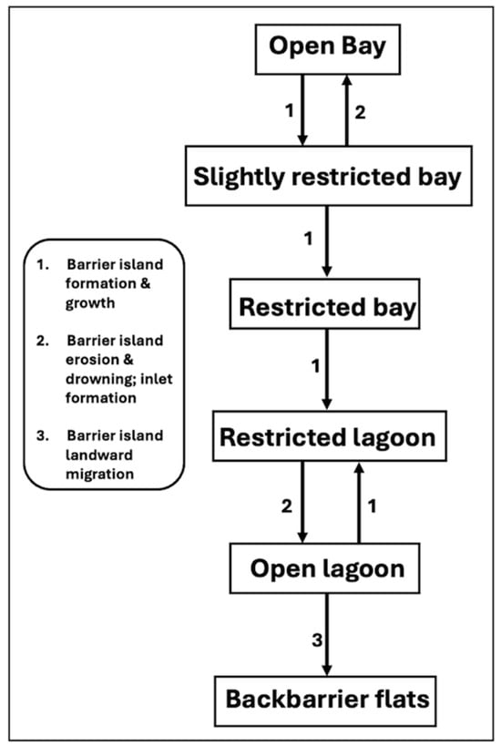 In this section, we take the linear sequence of community replacement in the Flanner Beach Formation from Section 4.2, which has several recurrences of the same community, and recast it as an STM, as shown in Figure 7. The environmental changes associated with the community replacements can be interpreted in terms of hydrographic changes associated with the growth, migration, erosion, and drowning of barrier islands and the opening and closure of barrier island inlets [45].
