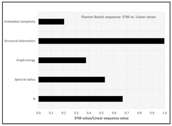 Comparing the two different representations of the Flanner Beach community transitions (undirected linear sequence vs. STM), the STM version collapses N from nine to six and produces a substantially lower spectral radius, graph energy, and embedded complexity index (Figure 8). The structural information Ig(G) is nearly equal.