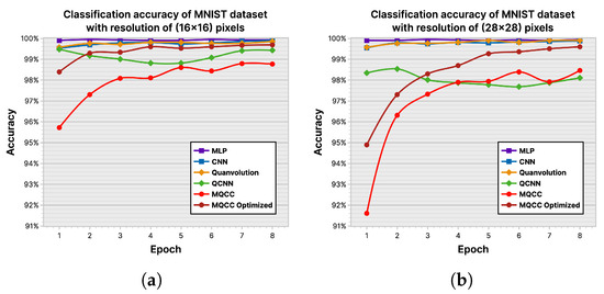 Quanvolutional neural networks [32] are a hybrid quantum–classical algorithm named eponymously after the quanvolutional layer added to a conventional CNN. These quanvolutional layers serve to decimate a 2D image, which is then sequentially fed into a quantum device. In this manner, the quanvolutional layer effectively exploits data locality. Yet, the model’s dependency on classical operations, specifically the decimation of input data and the repeated serial data I/O transfer, vastly increases compute time. In contrast, the required convolution operation is incorporated into our proposed MQCC, reducing classical–quantum data transfer. Moreover, MQCC takes advantage of parallelism inherent to quantum computers, while quanvolutional neural networks do not. Together, this allows the MQCC to apply convolutional filters to window data in parallel.