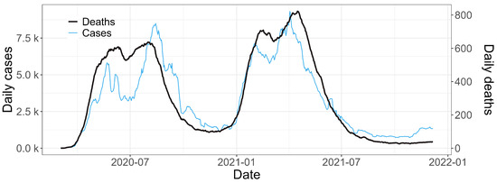 Seven-day moving average for the total COVID-19 cases and deaths in Peru between 3 March 2020 and 13 December 2021. The 14-day delay used in the modeling phase is not represented in this image.