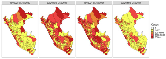 Heatmaps with the evolution in the total number of COVID-19 cases in Peru semiannually between 3 March 2020 and 13 December 2021.