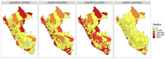Heat maps with the evolution in the total number of COVID-19 deaths in Peru semiannually between 3 March 2020 and 13 December 2021.