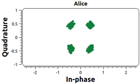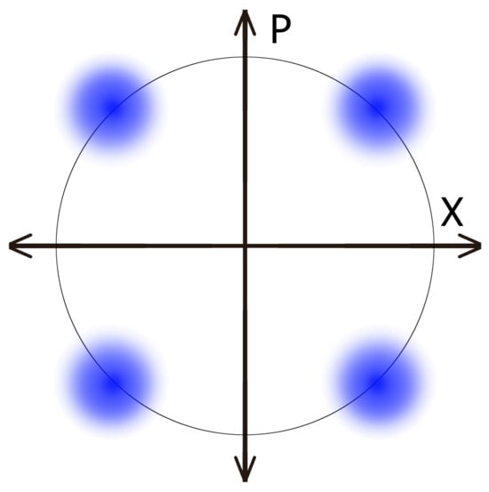 For ease of broadcasting, we use the classical communication system known as quadrature phase-shift keying (QPSK). This is a modulation scheme widely used for transmitting digital data over radio frequencies. While this will be a useful element of our protocol, the key itself will not be encoded in this manner. QPSK represents a set of techniques where data are encoded by varying the phase of a carrier wave among four possible values, typically , , , and . Each of these phase values corresponds to a different symbol (see Figure 1). There are four states; hence, this allows for the transmission of two bits per symbol.