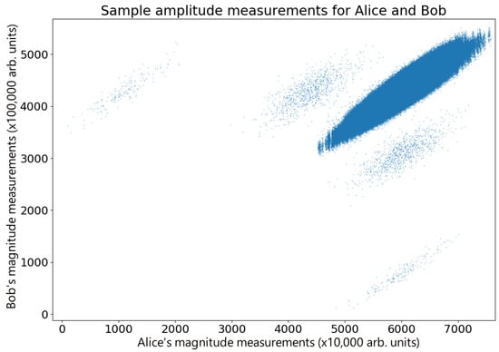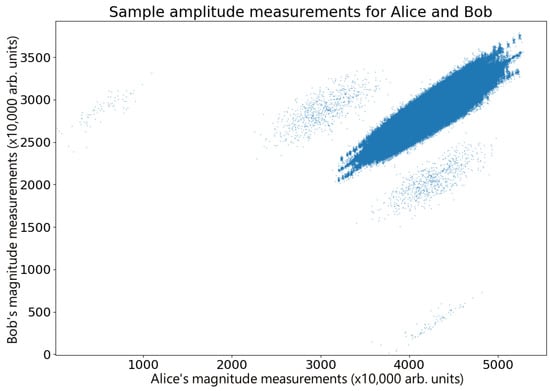 Correlations in thermal states. A sample (n = 3,000,000) of amplitude measurements performed by Alice and Bob. The measurement results were less correlated than the waveguide version displayed in Figure 3; however, they were still suitable for key distribution. The amplitude measurement results are shown in Figure A5. Again, ghost reflections can be seen in the data similar to the waveguide model and are therefore most likely a result of an impedance mismatch in Alice’s apparatus.