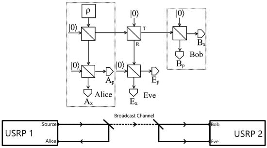 Method. A diagram of the central broadcast thermal protocol (top) accompanied by an experimental setup (bottom). A beam from a thermal source is divided between Alice and a broadcast channel. Eve intercepts Bob’s beam with a splitter of transmittance T, with the other splitters being 50:50. Each party performs heterodyne measurements to find quadrature values of their received broadcast. A photograph of Alice and Bob’s setup is shown in Figure A1. We perform this through using a pair of USRPs (Universal Software Radio Peripherals), one of which sends an initial broadcast towards a power splitter to be partially directed back into another channel representing Alice. The second output of this splitter is the broadcast channel, leading to a second power splitter representing Eve’s interception. Each of the outputs of this second power splitter leads to separate channels on a second USRP, representing Bob and Eve. The first diagram was originally used in ’Thermal state quantum key distribution’ [14] and is licensed under CC-BY 4.0.
