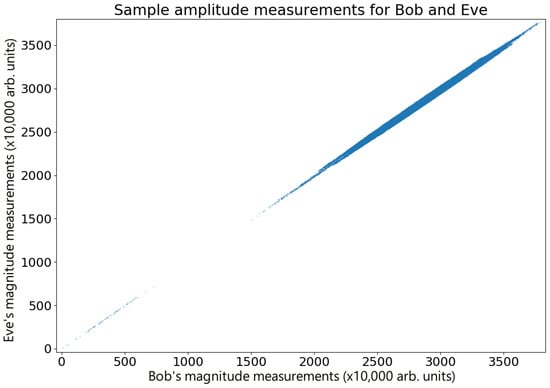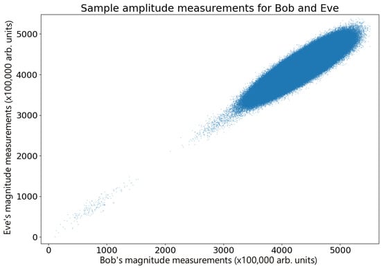 For continuous data, it is possible to calculate the correlation [17]; however these data are discrete, making the inaccessible. Figure 3 shows a plot comparing Alice and Bob’s amplitude measurements in a sample set of data ( points) after compensating for time delay errors. These measurements are highly correlated (r = 0.9264), clearly displaying the correlations expected for the Hanbury Brown and Twiss effect, with Bob and Eve’s measurements showing the same behavior (r = 0.99362), as shown in Figure 5. For the data presented here, and . While this specific example meets the standard QKD requirements for key exchange [25,33,34], shot-to-shot variability in the measurements resulting from thermal drift in the waveguide (see Figure 3) means that this is not always the case as occasionally fluctuates into negative numbers. However, the combination of advantage distillation and privacy amplification ensures that Alice and Bob are able to retrieve a key in general. Therefore, given that the waveguide tests showed some inconsistencies, we transitioned to a free space broadcast channel for more reliable results, which in any case is the more realistic scenario for secure key exchange.