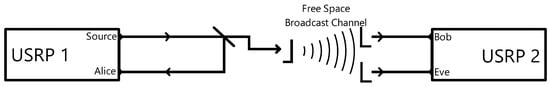 Experimental Setup. The experimental setup for a wired broadcast between Alice, Bob, and Eve. The first USRP sends the broadcast to a power splitter, which splits the signal between a separate input for Alice and a broadcast channel leading to the second USRP. An eavesdropper is added through splitting the broadcast channel, allowing the second USRP to act as both Bob and Eve through the use of two separate input channels. For wireless implementations of the protocol, the wired broadcast channel is replaced with a whip antenna and free space, with a pair of receiving antennae connected directly into the second USRP for Bob and Eve. Alice’s portion of the setup is unchanged.