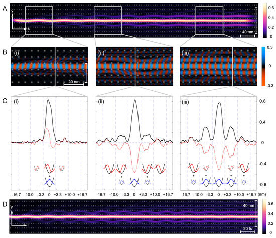 Chaos-assisted dynamical tunneling in superwires. (A) The probability density of a superwire eigenstate extracted from quantum dynamics simulation. (B) Real part of the wavefunction magnified in the regions (i–iii) indicated by grey boxes. (C) Cross-section (red dotted line) and (black line) at nm, nm, and nm (indicated by grey lines for (i–iii) in (B). The y-axis indicates the value of and whereas the x-axis corresponds to the y-coordinate in real space, measured in nm from the center of the initial channel. The oscillator eigenstates at the bottom schematically explain the contributions of the ground state (GS) in blue and first excited state components (1ES) in red in each channel. Large oscillator symbols indicate major contribution, small symbols a minor contribution, and missing symbols a negligible contribution to the wavefunction. (D) of a superwire in time extracted from a quasi one-dimensional model via paraxial approximation.