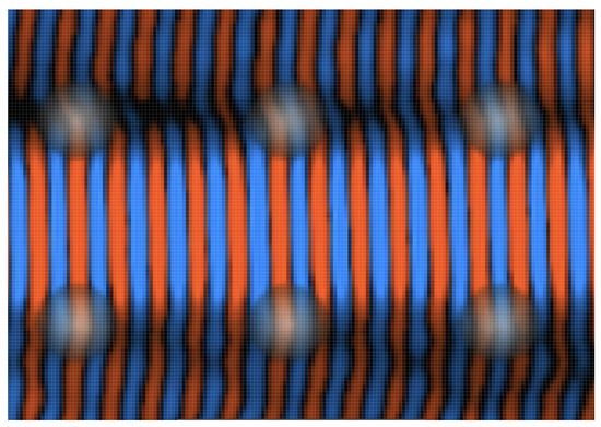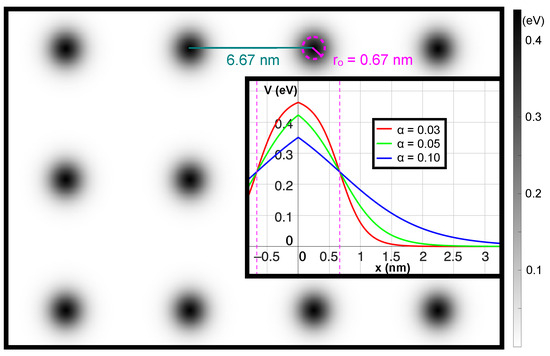 which yields a mixed system containing features of both non-integrable (chaotic) and integrable (regular) dynamics in classical and quantum considerations. In the Hamiltonian, and are the location and momentum of an electron with mass m, respectively. The potential is composed of individual bumps, each characterized by their amplitude and (effective) radius . These bumps are centered at positions which belong to a (finite) set of lattice points S. The smoothness of the Fermi-potential bumps is controlled by . We want to emphasize that this potential model is feasible for artificial superlattice experiments [2,3,4,5,6]. Without losing generality, we set to be 0.67 nm and to be 0.05 nm, with a lattice spacing of ca 6.67 nm. Remarkably, the potential features do not need to be strong for superwires to form. The height of the potential is scaled to approximately 0.45 eV at the top and 0 eV at the bottom. The resulting superlattice structure is illustrated in Figure 2.
