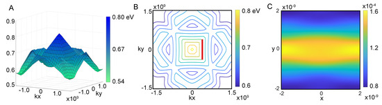 One of the bands we have found has a geometry close to a four-sided pyramid with a peak at the center. There is a gap between the peak of the pyramid and the band above. The contour map in panel B reveals the existence of nearly flat bands along the sides of the pyramidal structure. The flat bands shown are uniform along one momentum component; at the corners they turn between flat in to flat in . Flat bands are of considerable interest in the study of engineered superlattice structures [16,17,18,19,20,21] and superconductivity [22,23,24,25]. Flat bands play an important role in twisted bilayer graphene superconductivity [26,27,28,29,30] and their presence is vital for the dynamics of superwires.