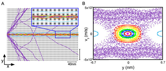 Figure 5 demonstrates clearly that most trajectories in this parameter regime (pink, blue, red, green, yellow, orange, and red) form stable wires inside the center channel, maintaining their confinement over extended distances. This stability is primarily due to what is termed the “rocking-chair” motion: trajectories oscillate in a manner that is slightly off resonance with the lattice’s periodic potential, preventing escape. This off-resonant oscillation underpinning the dynamical self-confinement of these superwire trajectories is corroborated by the emergence of stable Kolmogorov–Arnold–Moser (KAM) islands in the PSS shown in Figure 5B, where quasi-periodic elliptical orbits manifest.
