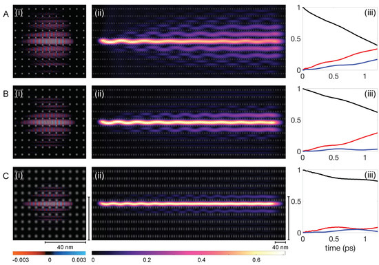 We conducted wavepacket dynamics simulations consistent with those described in Section 2. Figure 6 displays snapshots of at a specific timestep for three superlattice configurations in the left column: Figure 6(Ai) for = 0.03, Figure 6(Bi) for = 0.05, and Figure 6(Ci) for = 0.10. The snapshots reveal that smoother potential features, despite a slight reduction in potential height, result in better confinement of . The images also support that most of are contained within 4/5 of the simulation box and the matrix extension technique can be applied.