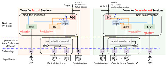 The first approach is for the model to learn the causal relationships between static long-term preferences, dynamic short-term preferences, and next items by comparing the factual and counterfactual sessions in the augmented dataset. To this end, we designed a neural network model with a dual-tower structure, where each tower is dedicated to learning the data distribution of either factual or counterfactual sessions. Both towers have identical structures and share parameters, implemented using attention-based neural networks. The dual-tower framework is depicted in Figure 1.