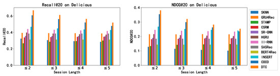 Recommendation performance of all methods on sessions with different lengths on Delicious.