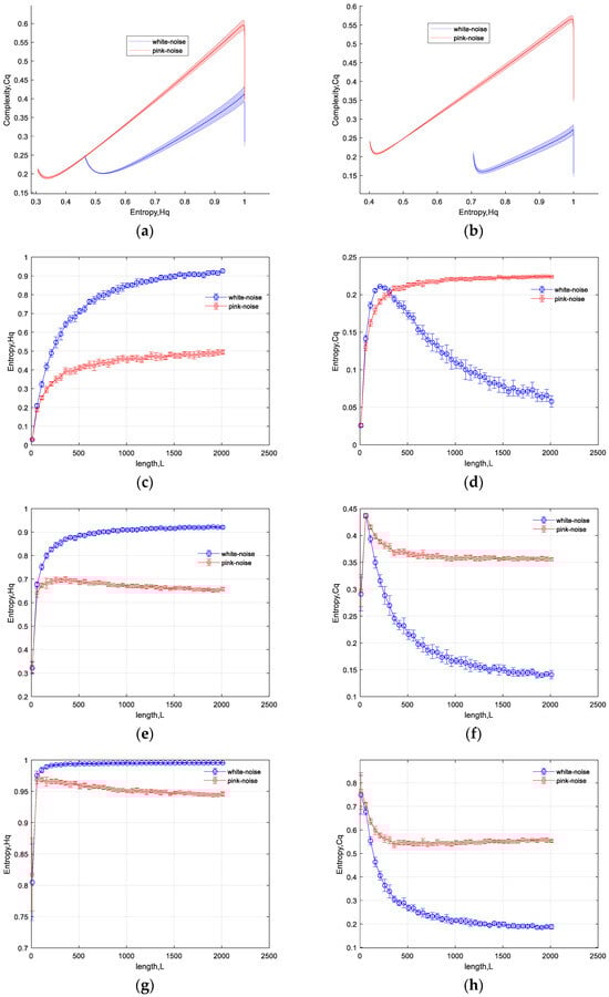 In order to validate the reparability and reliability of the TC-IPE-CP under short time series conditions, we vary the data length L from 10 to 2010 with a step size of 50 sample points. For each data length, 20 sets of independent noise are generated. The results are depicted in the Figure 1 below. Figure 1a,b depicts the TC-IPE-CP characteristics of white noise and pink noise for data lengths of 210 and 510, respectively. The standard deviation of the results from multiple experiments is represented by shaded regions. In the Figure 1a, the blue curve represents the characteristic of white noise, where entropy decreases initially to 0.46 with increasing q, and then increases to 1; and complexity decreases initially to 0.2 with increasing q, and then increases to 0.43. The trend of varying with the parameter q forms a curve on the plane. The red curve corresponds to the characteristic of pink noise, similarly forming a curve on the plane. From the distribution of the characteristic curves on the plane, it is easy to distinguish between these two types of noise. Furthermore, the observed consistency across multiple experiments, as indicated by the small magnitude of the shaded areas, underscores the algorithm’s robust stability. For a more comprehensive display of the influence of data length on entropy and complexity , we present curves depicting the variations of and with increasing length L, where q = 0.1, 1.01, and 2.01. The figures clearly demonstrate that classification of the two types of noise signals is feasible even when the length L is less than 100.