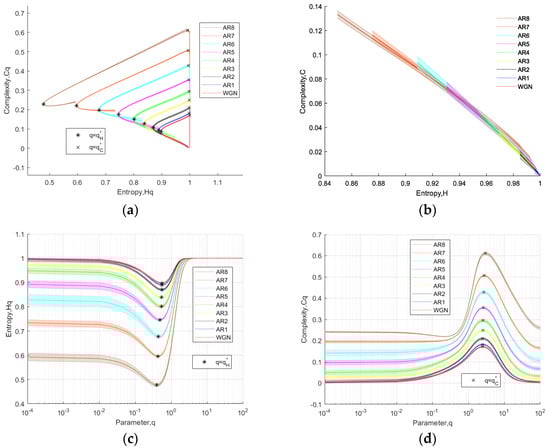 Following the analysis method outlined in reference [19], we identify the characteristic point corresponding to the minimum value of for each signal type, which is annotated as a black in the figure. Similarly, the characteristic point , representing the maximum value of for each signal type, is identified and annotated as a black × in the figure. It is evident that there are significant differences in and across each signal type, suggesting this as a distinguishing feature. To validate this point, we plot the q- curve in Figure 2c and the q- curve in Figure 2d, while simultaneously annotating the positions of and . It is evident that utilizing and provides effective discrimination for each type of AR signal and WGN.