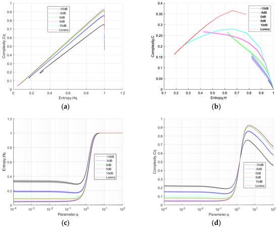 In this section, we assess the algorithm’s performance under noisy conditions by generating signals at different SNR through the introduction of Gaussian white noise into the Lorenz time series. We solve the Lorenz system represented by Equation (12) using the fourth-order Runge–Kutta scheme with a time step of Δt = 0.001, recording 50,000 data points. For each signal-to-noise ratio condition, we conducted 20 independent experiments using both TC-IPE-CP and RC-PE casualty plane, and calculated the entropy and complexity. From the results in Figure 3a, it can be observed that the curves of and under different (SNR) conditions for Lorenz signals in the TC-IPE-CP exhibit a high degree of similarity. Moreover, the curve for −10 dB closely resembles the curve for the normal signal, indicating that noise has the least impact on the performance of the TC-IPE-CP. Furthermore, the trends of the q- and q- curves for Lorenz chaotic signals under different SNR in Figure 3c,d are largely consistent, providing additional evidence of the superior noise resistance performance of the TC-IPE-CP. In comparison, the curves for RC-PE-CP of Lorenz signals under different SNR in Figure 3b exhibit relatively scattered patterns.