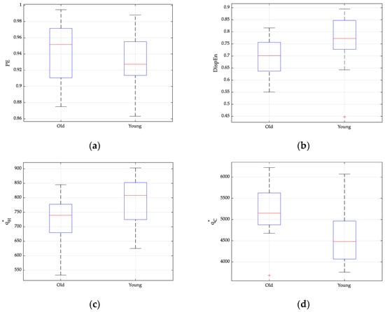 Boxplots of distinct entropy approaches computed from the RR intervals of healthy young and healthy elderly participants. (a) PE analysis result; (b) DE analysis result; (c) analysis result; and (d) analysis result. The symbol + in this figure represents outlier value.