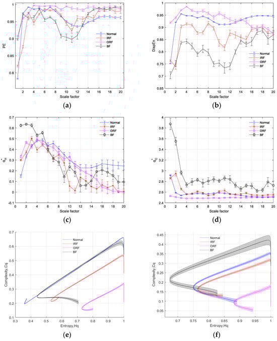 Multiscale entropy analysis results of four types of bearing fault signals. (a) PE analysis result; (b) DE analysis result; (c) analysis result; (d) analysis result; (e) - curves of TC-IPE-CP with scale = 1; and (f) - curves of TC-IPE-CP with scale = 5. (Note: In this paper, refers to the value of q when the entropy is at its maximum, and refers to the value of q when the complexity is at its maximum. These will not be annotated further in subsequent sections).