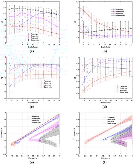 Multiscale entropy analysis results of four types of ship-radiated noise. (a) analysis result; (b) analysis result; (c) PE analysis result; (d) DE analysis result; (e) - curves of TC-IPE-CP with scale = 1; and (f) - curves of TC-IPE-CP with scale = 5.