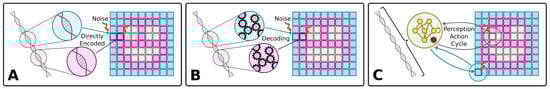 (A–C) Illustration of different ways of genetic encodings of a phenotype of, here, a two-dimensional smiley-face tissue composed of single cells. (A) Direct encoding: Each gene encodes a specific phenotypic trait, here, of each specific cell type of the tissue, colored blue, pink, and white. (B) Indirect encoding: A deterministic mapping between the genome and different phenotypic traits, here, again of each cell type (shown for completeness, but not investigated here due to reasons discussed in the Section 5). (C) Multi-scale competency architecture: Encoding of functional parameters of the uni-cellular agents which self-assemble a target pattern via successive local perception–action cycles [] (as detailed in Figure 2A). In all three panels, we schematically illustrate, from left to right, the genome, the respective encoding mechanism, and the corresponding phenotype; colors indicate cell types, and arrows indicate the flow of information and environmental noise, affecting each cell during the developmental process.