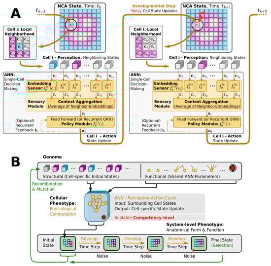 NCAs exhibit a striking resemblance to the genome-based multi-scale competency architecture of biological life [] as illustrated in Figure 2: an organism’s entire building plan is encoded in its genome (corresponding to the NCA parameters), while its cells collectively run the self-orchestrated developmental program of morphogenesis (realized by the NCA layout and ANN architecture) via perception–action cycles at the uni-cellular level (cell state updates in the NCA, cf. Figure 2A). Starting from an initial cell state configuration of the NCA, the details of a virtual organism are then, step by step, “refined” in a collective self-organizing growth phase on the cellular level, and maintained against cell state errors later on in the virtual organism’s lifetime. Thus, a single NCA, once trained, guides the growth and integrity of a virtual organism’s tissue via intracellular information processing and intercellular communication, imitating in silico the multi-scale competency-based process of morphogenesis and morphostasis. (Notably, although an NCA update function—the cells’ ANN—is trainable in principle, current approaches pre-train (or evolve, as in our case) the ANN parameters to subsequently study the NCA behavior (such as simulated morphogenesis). Thus, an NCA’s self-orchestrated (developmental) program is defined by a particular set of ANN parameters rather than being acquired during the lifetime of the NCA. Here, we investigate the efficiency at which an evolutionary process arrives at satisfying parameters under various conditions.)