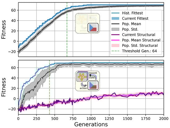 Typical fitness trajectory over several generations of CMA-ES [] of an NCA-based Czech-flag morphogenesis task without (top) and with competency (bottom), corresponding to (i) direct and (ii) a multi-scale competency encoding of the target pattern as discussed in the text, representative of related experiments at similar system parameters (cf. Figure 4). We present the historically- (blue) and currently best fitness value per generation (light blue), and the mean (black) and variance (gray) of the fitness of the entire population. Moreover, the current structural fitness (purple), the mean structural fitness of every generation (magenta), and the corresponding standard deviation (light-pink area) are presented; in the top panel, the structural and phenotypical fitness is equivalent, and thus only the latter is shown. The task is solved when a final fitness score of is reached (marked by the green dashed line), i.e., when cell types are correctly assumed after developmental steps. The cartoon insets represent the perception–action cycle of the NCA, assembling an initial (random) arrangement of cell types into the target pattern; for the direct case (top panel), the NCA ANN is disabled, which is illustrated by masking the agential parts in the cartoon.