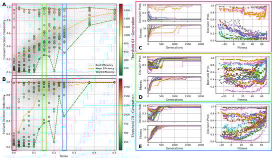 (A) The evolved decision-making probability for different noise levels when a fitness threshold of 64 for the Czech flag task is reached; each symbol represents an independent lineage with a color-coding that indicates the number of generations it took for that particular lineage to cross the specified fitness threshold. The green/orange/red dashed lines indicate at which value of the evolutionary process crossed the fitness threshold the fastest/on average/the slowest (i.e., in the least, average, or largest number of generations) for each noise level. (B) Same as (A) but with a fitness threshold of 70. For both (A,B), the red/green/blue frames emphasize the noise level and corresponding to panels (C–E), respectively: The latter show the evolution of the decision-making probability/fitness (top/bottom left panel) and the value of the decision-making probability as a function of the corresponding fitness during the evolutionary process of each lineage (right panel) for all lineages (indicated via color-coding) at the specified noise level. Results are shown for an RGRN-agent architecture with redundancy , and are qualitatively similar to those of an FF-agent architecture.