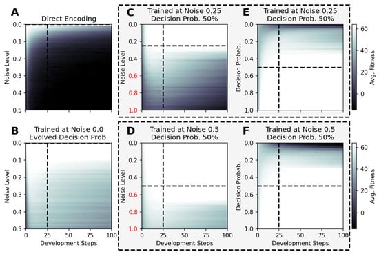 The average fitness score of 100 independent evaluations of selected NCA results utilized at noise (A–D) and competency-level conditions (E,F), which have not been experienced during training for an increased total lifetime of 100 time steps. The respective NCAs have been evolved at zero-noise without competency (A), with evolvable competency (B), and under different noise conditions and decision-making probabilities (C–F), with a fixed number of developmental steps; the results of all panels except for (B) are based on RGRN-agent architectures with the training conditions given by titles and dashed lines. The data presented in panels (C,E) and (D,F) are respectively based on the same NCA solution (indicated by the dashed frames), while the noise level is varied in (C,D) at a fixed competency level of , and the competency level is varied in (E,F) at a fixed noise level of (, )], respectively.