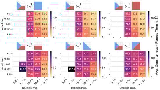 In Figure 4A,B, we present the corresponding fitness scores of a maximum of 2000 generations of CMA-ES for different noise levels , averaged over different values of the decision-making probability for both FFagents and RGRN agents. Moreover, for each realization of and , we utilize experiments with different redundancy numbers and employ 15 statistically independent EA runs for each parameter combination , , and R, and thus arrive at 75 statistically (and functionally, with respect to an agent’s ANN architecture) independent fitness trajectories per (, ) combination; see Section 4.1 and Appendix D for more details on the EA parameters. In Figure 4C, we present the average number of generations it takes to solve the problem (to reach a fitness threshold of ) for each combination of and , aggregated over the agents’ ANN architectures, FF or RGRN, and the respective redundancy numbers R for 15 statistically independent EA runs each; in Figure 4D, we present the data from Figure 4C but separately for both ANN architectures.