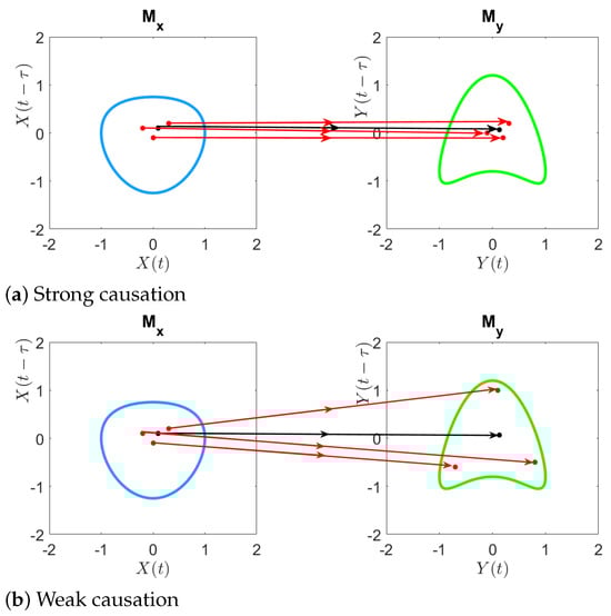 Figure 1a corresponds to the situation when there is a strong causal relationship from X to Y, and Figure 1b illustrates the case when there is only a weak causation. For illustration purpose, the dimension of the shadow manifold was chosen to be , the neighborhood of is represented using a the simplex consisting of three nearest neighbors, and the neighborhood of is represented in the same way.
