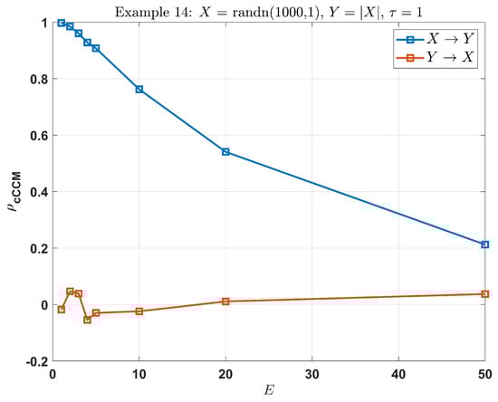 In this subsection, we examined the causal relationship in systems with memory (Examples 10–14) using CCM and cCCM under different choices of E and .