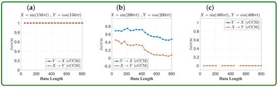 where and are independent, and . We chose and and then the cCCM and CCM values between these two time series are