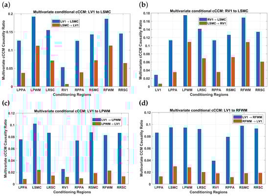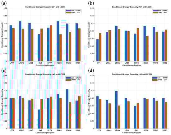 FMRI-based causality analysis using multivariate conditional GC with respect to individual regions. (a) , (b) , (c) , (d) . It can be seen that the results of multivariate cCCM and GC are largely consistent for (a,d). However, for (b,c), multivariate cCCM and GC deliver very different results. In particular, for the conditional causality from and , the results of multivariate cCCM with respect to other individual regions are consistent with their bivariate counterparts and also reflect the impact of inter-region dependence on the conditional causality. However, the corresponding results of multivariate GC with respect to other individual regions vary significantly with the region under consideration, and 50% or more are no longer consistent with those of the bivariate GC.