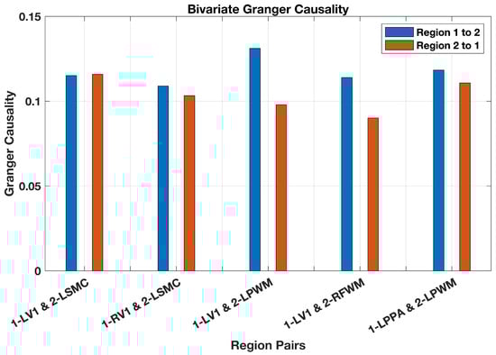The first practical causal analysis framework is Granger Causality (GC), which was proposed by Granger in 1969 []. GC is a statistical approach that relies on a multi-step linear prediction model and aims to determine whether the values of one time series are useful in predicting the future values of the other. As a well-known technique, the validity and computational simplicity of GC have been widely recognized [,,,]. At the same time, it has also been noticed that when there exists instantaneous and/or strong nonlinear interactions between two regions, GC analysis may lead to invalid results [,]. Moreover, GC may not be able to detect the causation in deterministic settings [,].