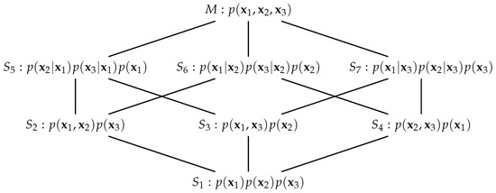 which may be conveniently pictured as the partially ordered lattice in Figure 1. The submanifolds and are necessary for the definition of the information-geometric PID [3] and the others will be considered in the sequel. Lattices similar to that in Figure 1 appear in [8,35,36] in relation to information decomposition, and in [37] who consider dually flat manifolds on posets. See also [38], and references therein, for the use of a variety of lattices of models in statistical work.