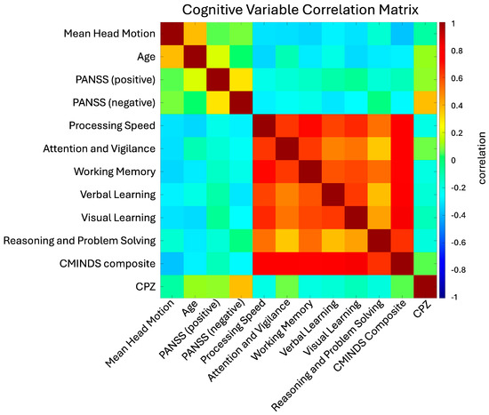 To correct for possible confounds in the data, a multiple linear regression was employed alongside standard hypothesis tests. This regression separately modeled the effects of site, age, gender, and diagnosis on subject-level joint and source entropies. Additional regression analyses examined the effects of clinical (PANSS positive and negative) and cognitive (CMINDS composite) scores on subject entropy distributions, again while correcting for site, age, and gender effects. As cognitive scores are highly correlated (Figure 2), it was decided to examine only the most general score, namely the CMINDS composite score [62], to avoid effect cross-contamination.
