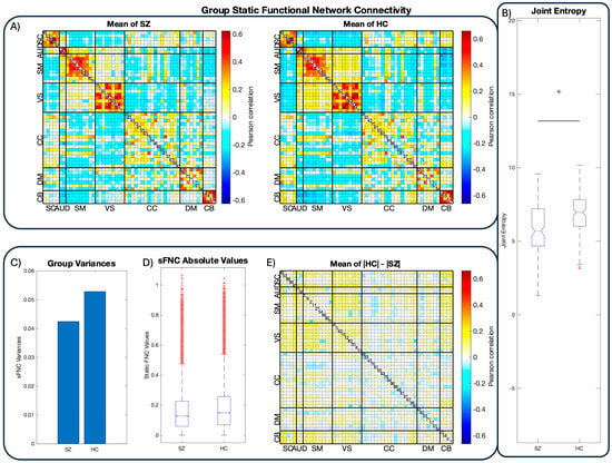 Figure 3. Group-level FNC and joint entropy. The results from group-level functional network connectivity (FNC) and joint entropy estimates. Panel (A) displays the connectivity matrices of the respective groups after mapping preprocessed fMRI images to the NeuroMark atlas [35]. Functional networks (FNs) are ordered and labeled according to their functional domains. Panel (B) displays the joint entropy distributions of each group’s dynamic functional network connectivity in boxplot format. In line with previous work [32], the healthy controls display substantially higher joint entropy than the schizophrenia patients, suggesting reduced flexibility in patient connectivity and computation. Visual inspection suggests that schizophrenia patients’ functional connectivity is generally dampened compared to healthy controls, in line with the dysconnectivity hypothesis and its supporting work. Panels (CE) confirm this supposition by demonstrating increased variance in control static FNC and the fact that the controls show higher average sFNC magnitudes than patients.