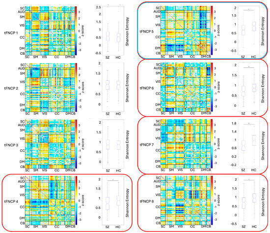 Having confirmed that subject joint entropy rate differs between populations, an obvious question is whether these differences are evenly distributed amongst tFNCPs or whether they are concentrated within a subset of them. To answer this question, we compared the group-level entropy rates of each tFNCP using the Kolmogorov–Smirnov two-sample test, with the false discovery rate [61] correcting for multiple comparison. A Student’s t-test was also applied to the entropy rate distributions, which passed the Jarque–Bera test for normality. This approach reveals decreased patient entropy rates in five of eight tFNCPs (Figure 4), with no qualitative differences between the Kolmogorov–Smirnov two-sample test and Student’s t-test results. Figure 4 displays the connectivity matrices and entropy distribution boxplots of each tFNCP, with group entropy means, variances, and test statistics listed in Table 2.