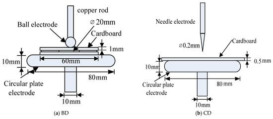 In the laboratory, four types of PD models are designed, as shown in Figure 5. All circular electrodes have a diameter of 80 mm and a thickness of 10 mm. All PD models are placed in the tank containing transformer oil.