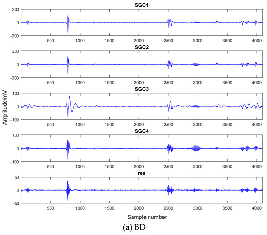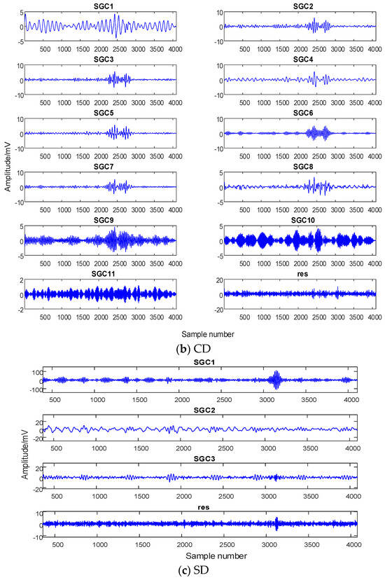 From Figure 9, it is evident that the SGMD decomposition yields distinct SGC components for different PD types. For instance, a BD signal generates five SGC components, while a CD signal produces twelve SGC components, with four SGC components for SD, and six SGC components and a residual component for FD. The selection of relevant SGC components for subsequent analysis becomes necessary.